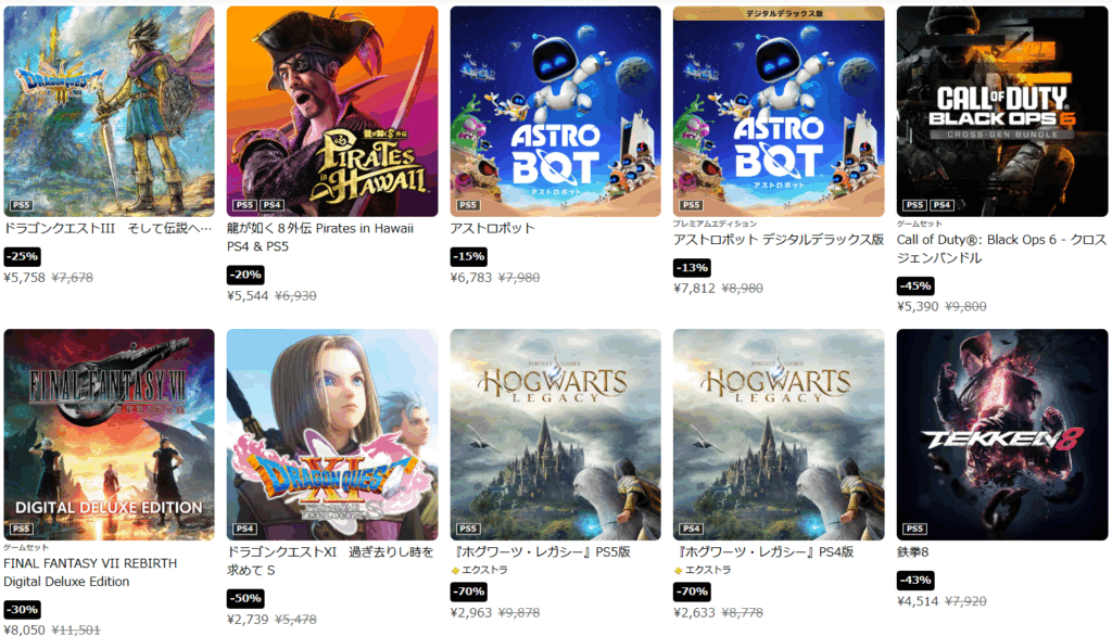 今回は新作、有名タイトル、旧作等幅広いタイトルがセール対象となっています。